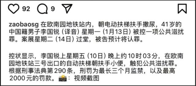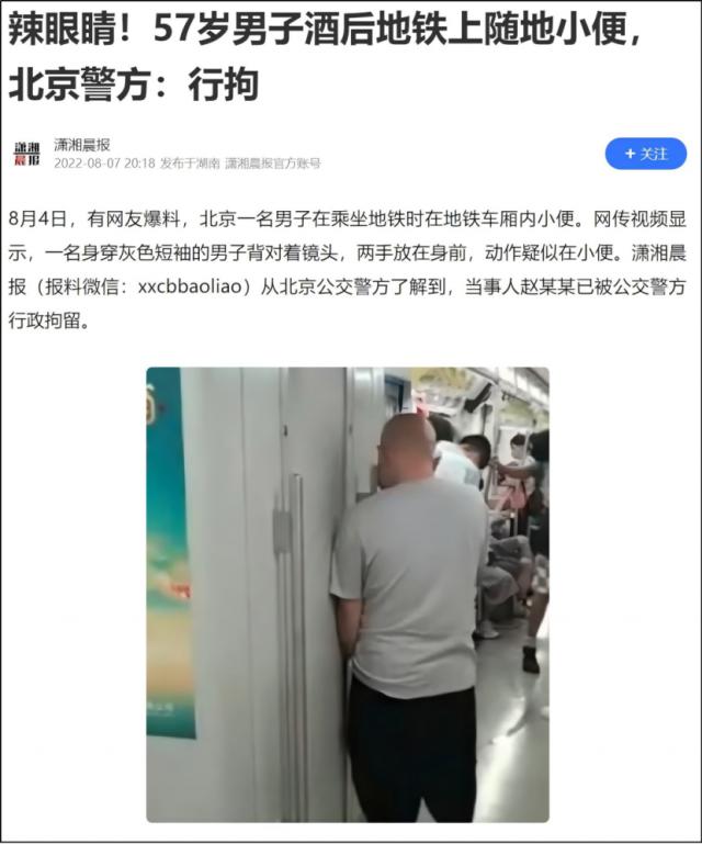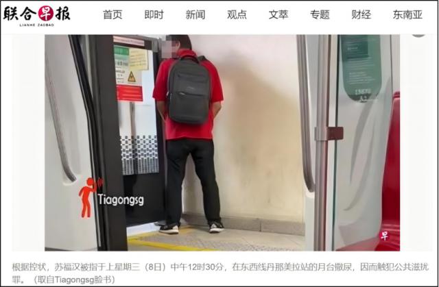 原来一名 41 岁的中国男子酒足饭饱下,在地铁站出口处旁若无人地尿尿。